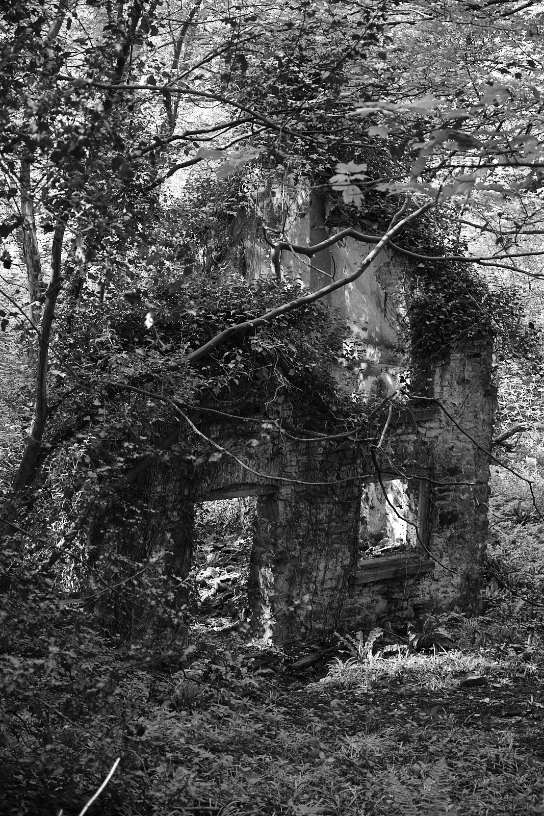 Derelict building reclaimed by the woods.